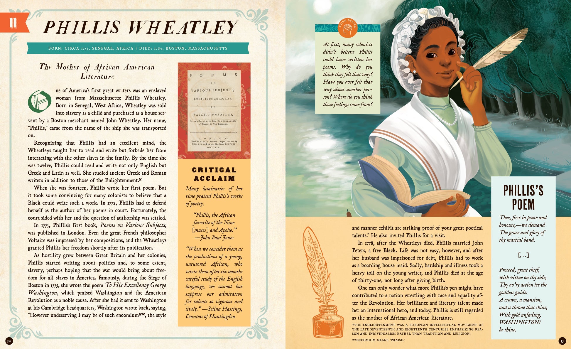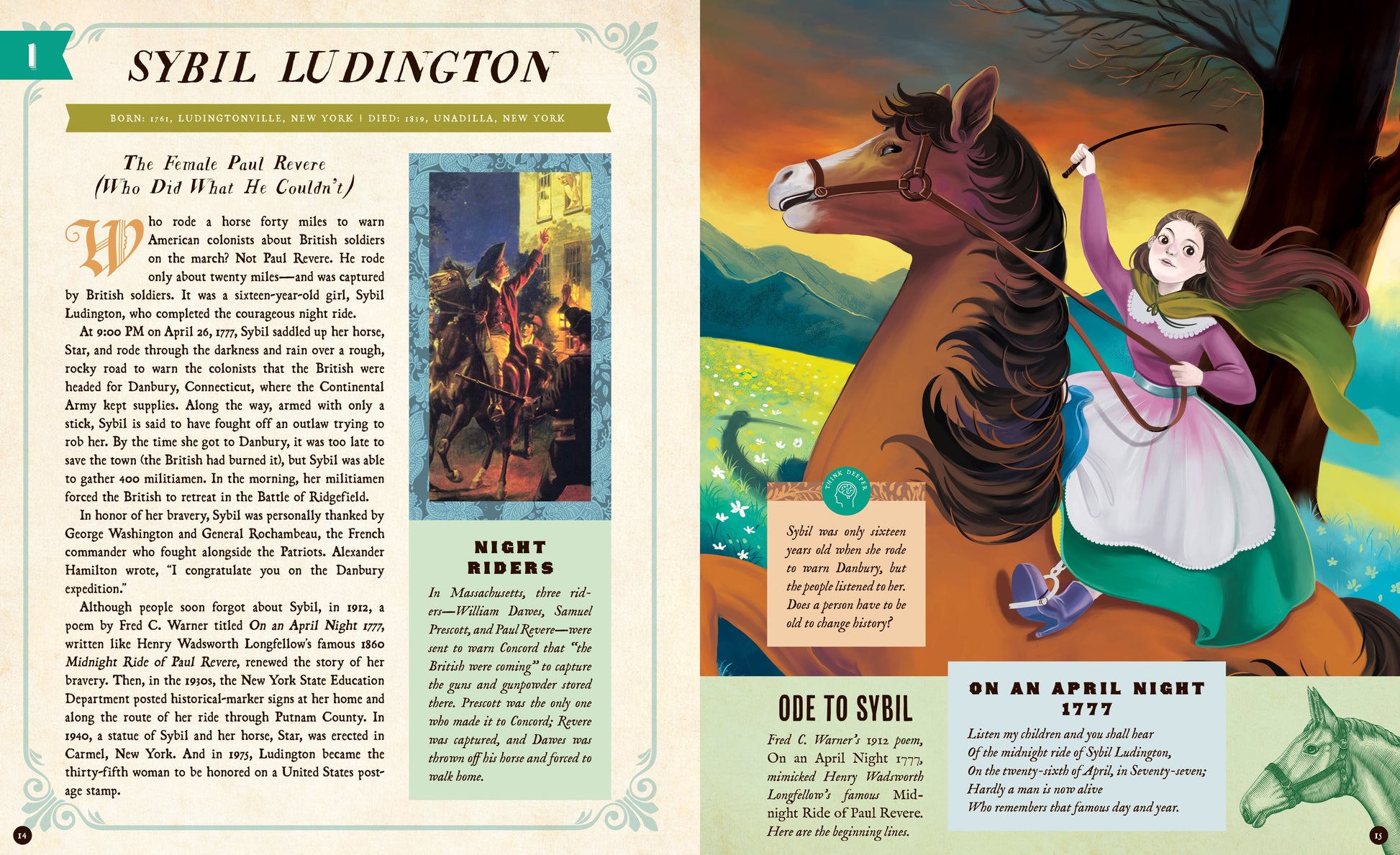 Readers will meet Sybil Ludington, the sixteen-year-old girl who rode all night to warn of a British attack (and didn't get caught!); Nancy Hart: the indomitable woman who captured six Loyalist soldiers; Cuffee Wells Saunders, the talented physician who won his freedom and saved lives serving in the Continental Army; Phyllis Wheatley, the gifted Black poet whose work was praised by Voltaire and George Washington; Deborah Sampson, the colonial woman who dressed as a man to enlist in the Continental Army; Peter Salem, the former slave who became the hero of the Battle of Bunker Hill; and many more! Read, learn, and discover in beautiful new ways that America's origin story really is everybody's story.